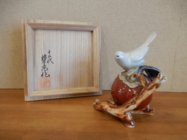 11代の頃から脈々と受け継がれる柿のモチーフの作品です。 目白の白色とのコントラストも美しく、 葉や枝、蔕に至るまで一切の妥協を許さない完成度の高い逸品です。