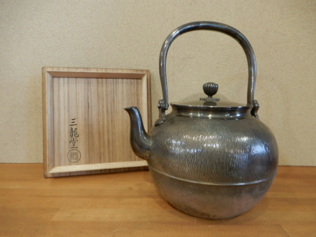 並品の物になりますと銅に銀メッキ又は錫メッキなどして、作られた物もございます。 銀はお湯の味を変えない為、銀瓶は煎茶には最適な道具とされています。