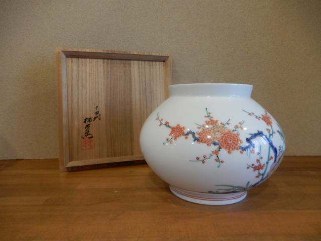 今回買取させていただいたのは、人間国宝 十四代酒井田柿右衛門【錦 梅鳥文 花瓶】
