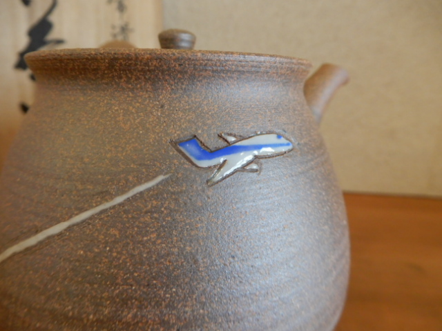ANAのセントレア就航記念の際に製作された飛行機柄のユニークな急須です。常滑の柔らかい土の質感がそのまま手になじみます。