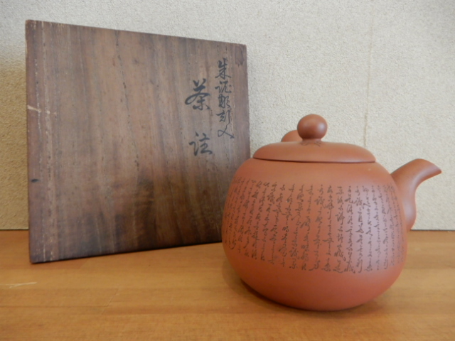 きめ細やかな急須に、大変見事な細密文字彫刻が施された繊細かつ上品な作品です。